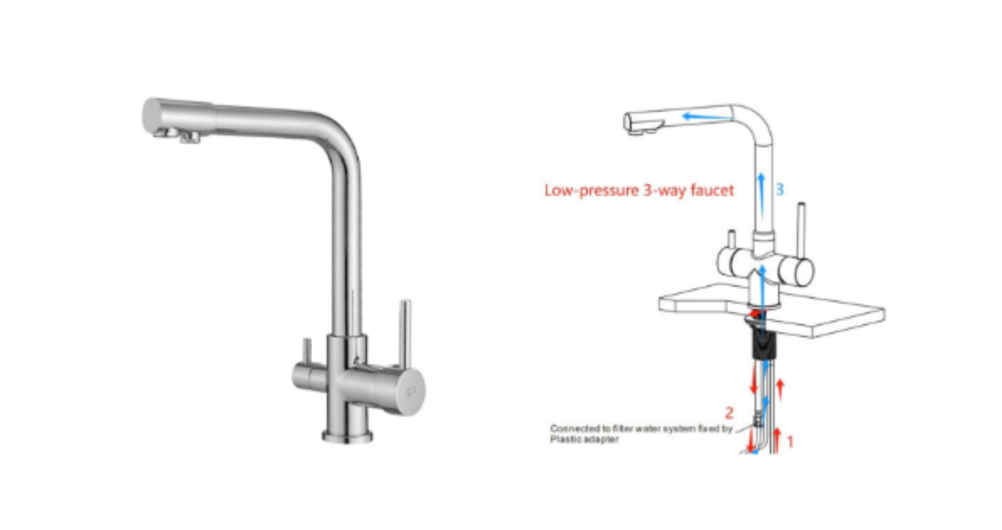 In this option, an integrated kitchen faucet is installed, with Crystal Water purifier mounted beneath the kitchen counter. This kitchen faucet has an integrated, low pressure, water-pipe integrated, which is connected to the purifier beneath the counter. This option requires minimal professional plumbing assistance, providing an elegant drinking water faucet and a permanent installation.